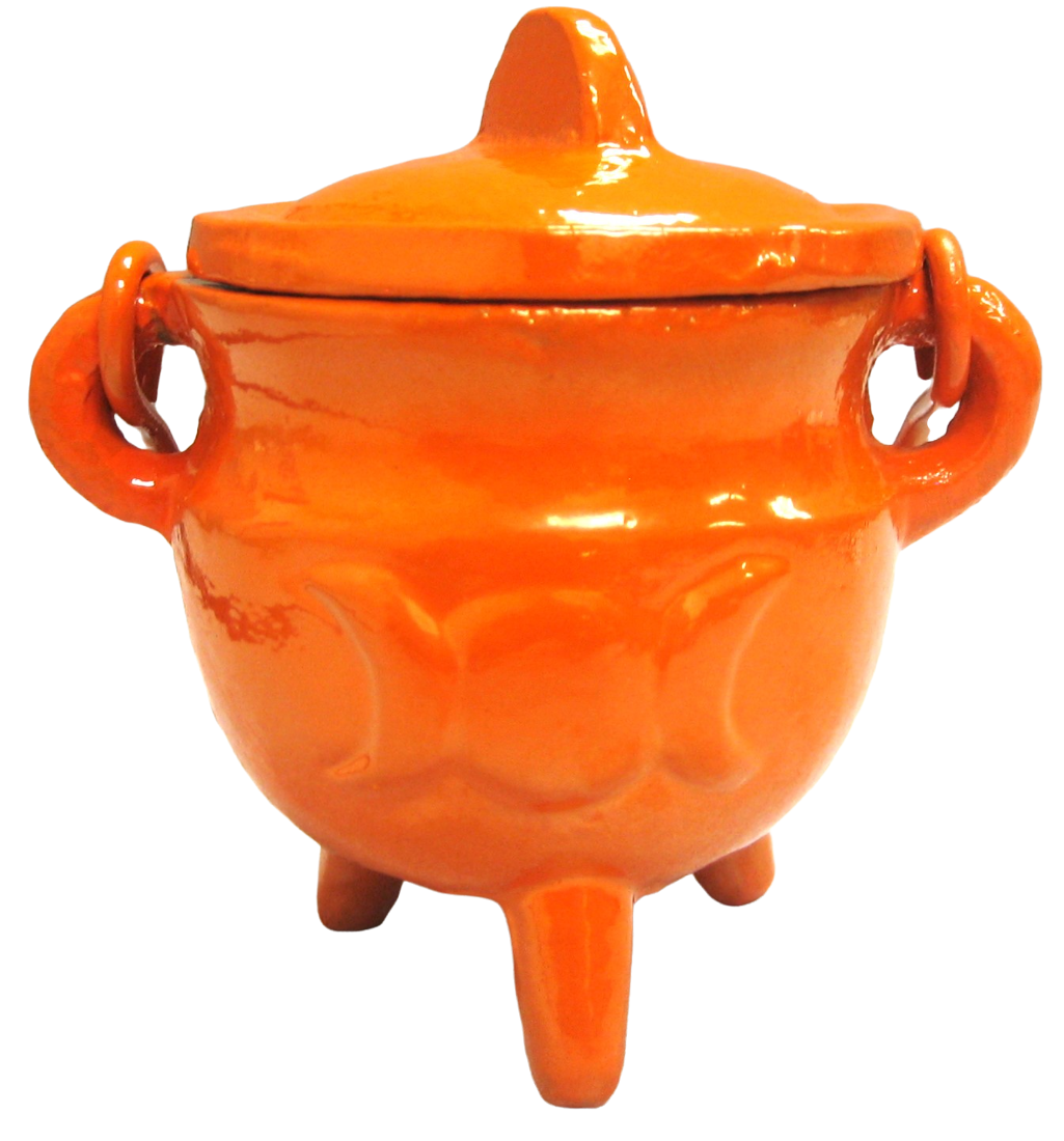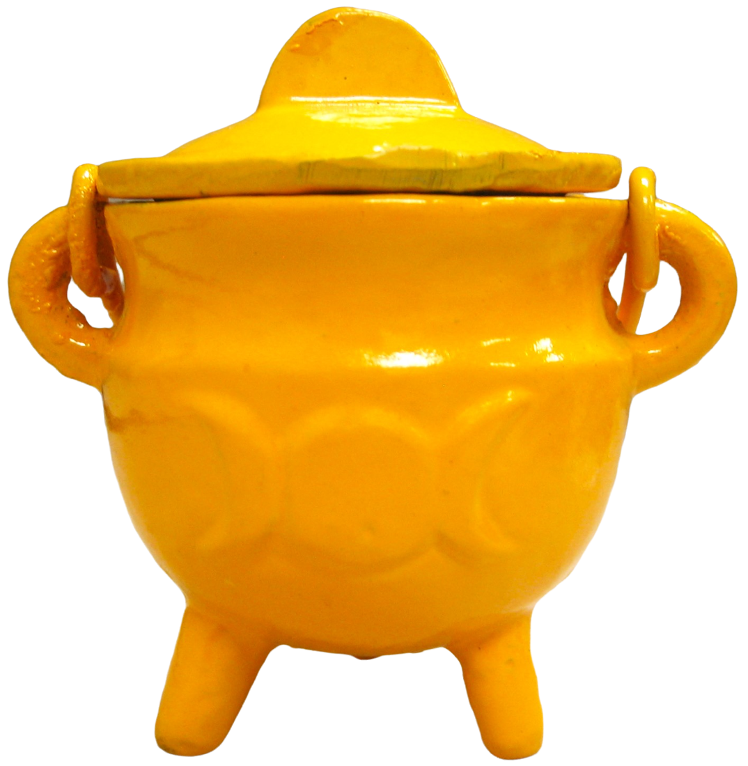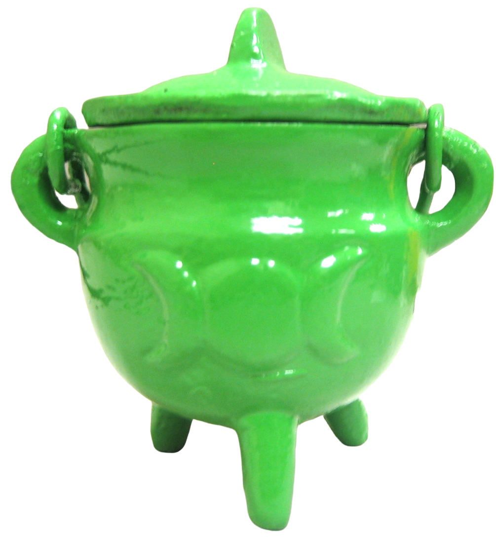 Crystalo Black Iron Cauldron with Lid Triple Moon Comes in 8 different colors: Black Blue Yellow Pink Green Red Orange Purple Dimensions Approximately: 3 inches high 2.75 inches diameter Material: Iron
